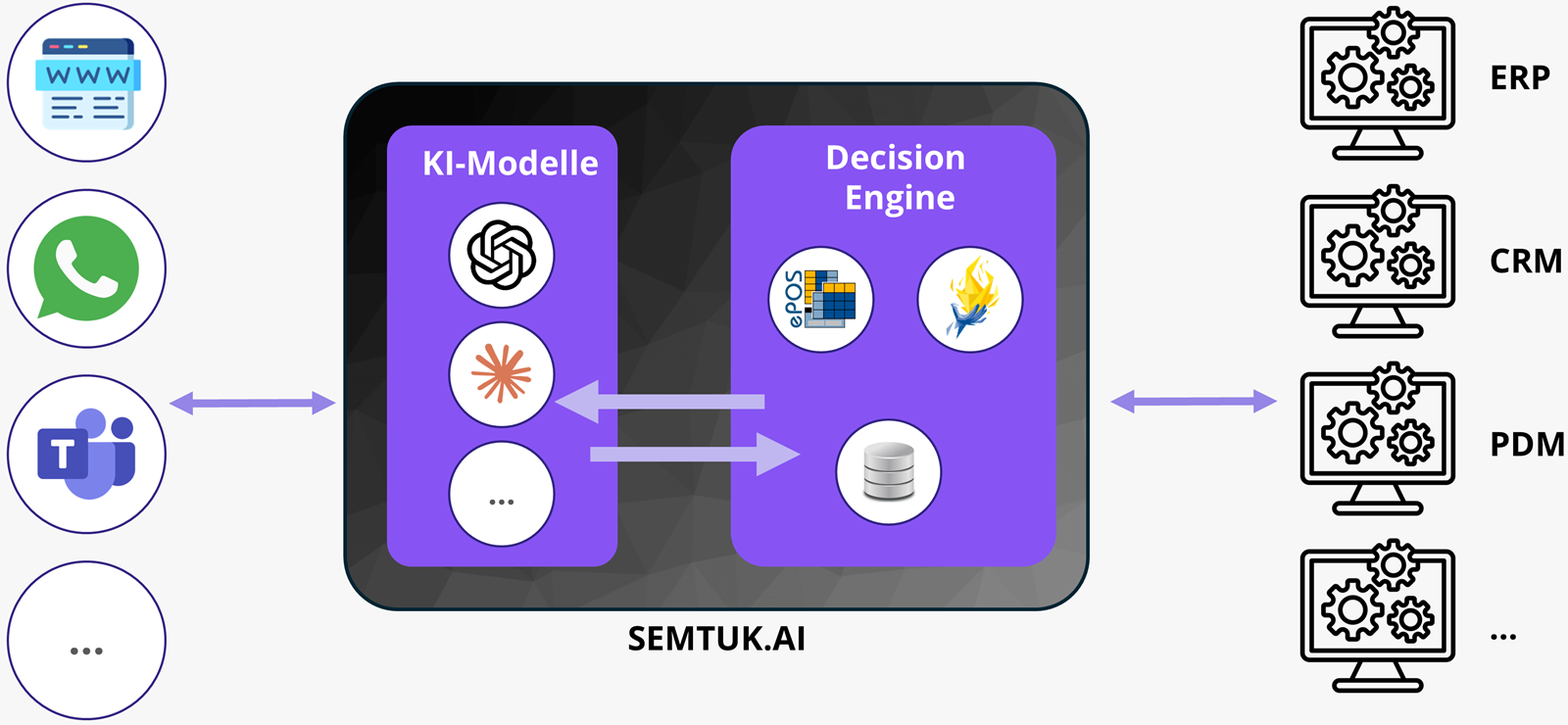Struktur trifft Unstruktur - Daten sauber getrennt: Unsere KI-Suite verarbeitet strukturierte und unstrukturierte Daten getrennt – für maximale Kontrolle in den Prozessen zwischen Ihrem Unternehmen und den KI-Modellen. Mit der in SEMTUK.AI integrierten Decision-Engine (Entscheidungslogik- bzw. Business-Logik-Software) können Sie die Verarbeitung Ihrer Daten gezielt steuern.